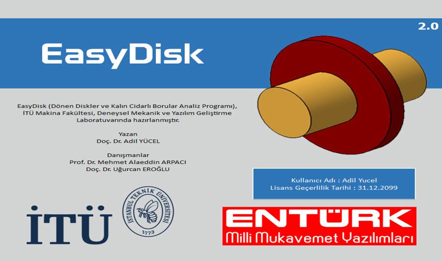 EasyDisk2 yazılımı, Doç. Dr. Adil Yücel tarafından, ENTÜRK Milli Mukavemet Yazılımları Projesi kapsamında, İTÜ Makina Fakültesi bünyesinde bulunan Deneysel Mekanik ve Yazılım Geliştirme Laboratuvarı'nda geliştirilmiştir. Detaylar için tıklayınız.