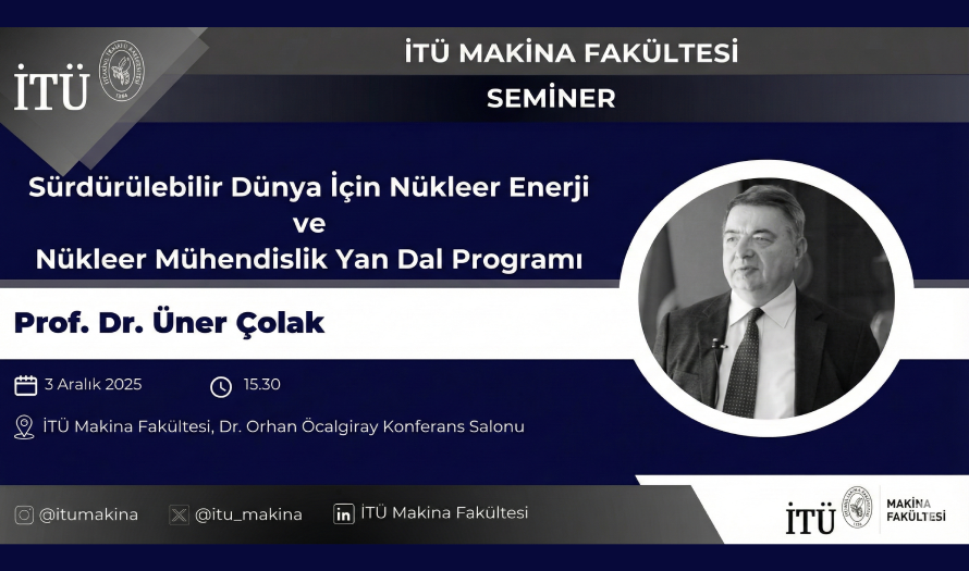 İTÜ Makina Fakültesi DAN102 Seminerleri kapsamında Sayın Prof. Dr. Üner Çolak tarafından "Sürdürülebilir Dünya için Nükleer Enerji ve Nükleer Mühendislik Yan Dal Programı" semineri verilecektir. Tüm öğrencilerimiz ve akademik personelimiz davetlidir. Detayşı bilgi için tıklayınız.